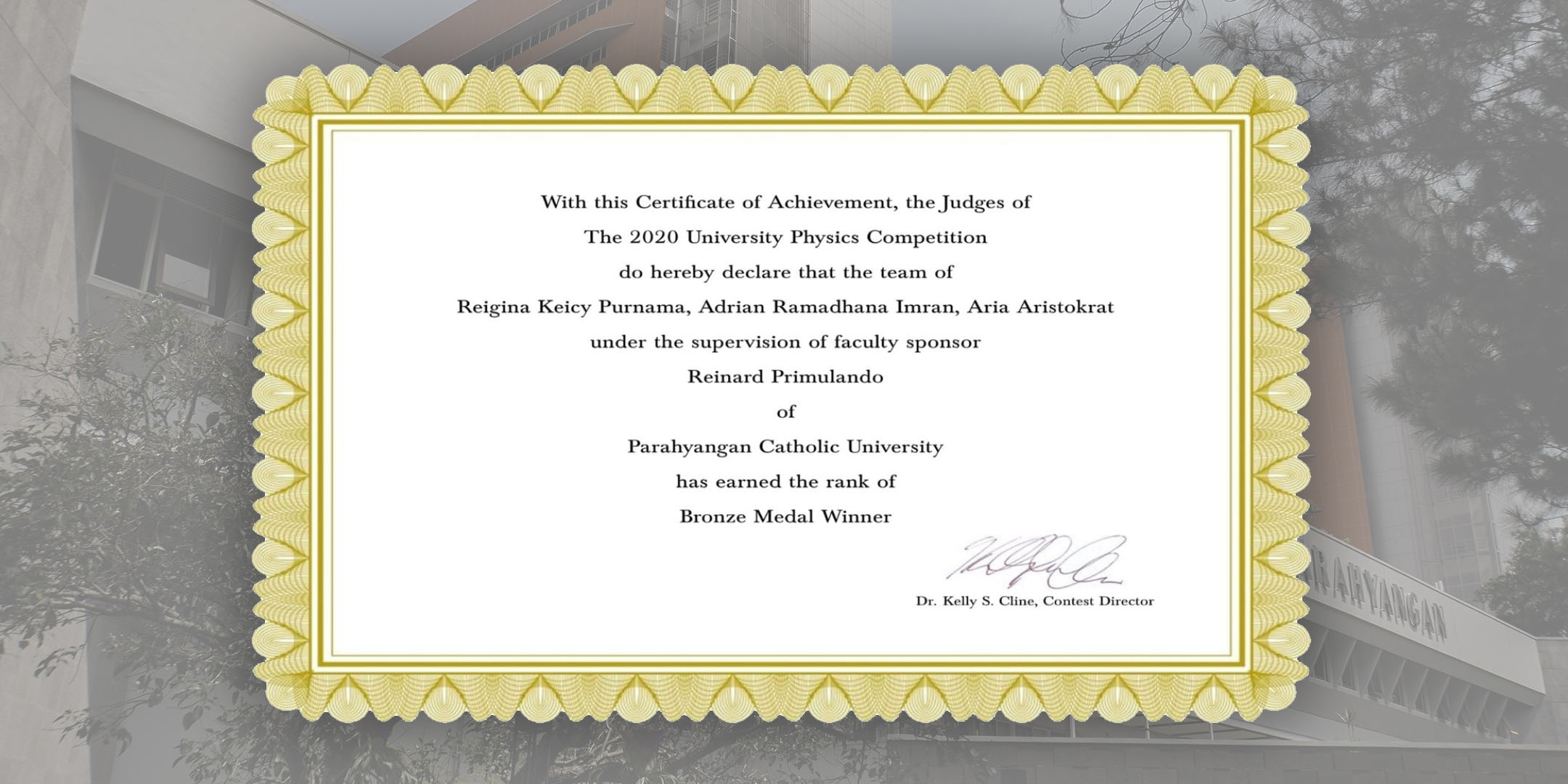 Pada 6 hingga 7 November 2020 lalu, tiga orang mahasiswa Fisika Universitas Katolik Parahyangan (Unpar) yang tergabung dalam Tim Pemodelan Fakultas Teknologi Informasi dan Sains meraih Bronze Medal atau Juara Ketiga dalam The 2020 University Physics Competition (UPC). Mereka adalah Reigina Keicy Purnama, Adrian Ramadhana Imran dan Aria Aristokrat yang dibimbing oleh Dosen Fisika Unpar Reinard Primulando, Ph.D.