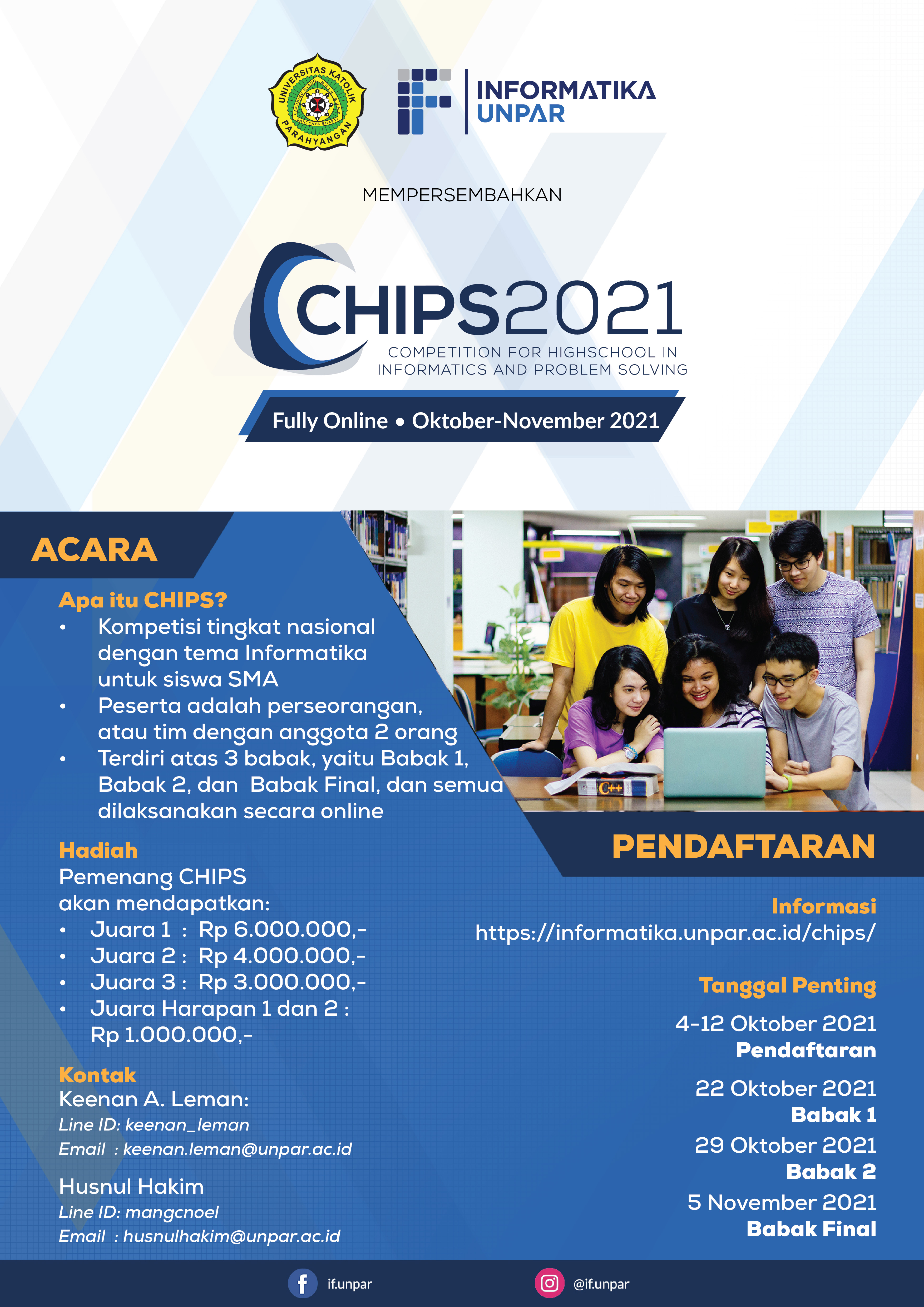 Competition for High School in Informatics and Problem Solving 2021 (CHIPS 2021) merupakan kegiatan rutin yang diselenggarakan setiap tahun oleh Jurusan Teknik Informatika UNPAR. Kegiatan ini diselenggarakan dengan tujuan untuk