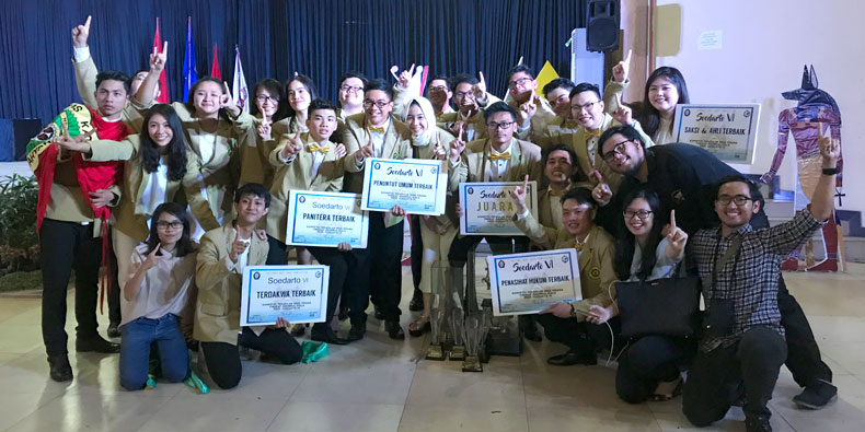 Delegasi Fakultas Hukum Universitas Katolik Parahyangan (FH Unpar) meraih juara pertama dengan gelar Terdakwa terbaik, Saksi dan Ahli terbaik, Panitera terbaik, Penuntut Umum terbaik, dan Penasihat Hukum terbaik dalam National Moot Court Competition Piala Prof. Soedarto VI (NMCC Soedarto VI) yang diadakan pada 15-18 September 2017.
