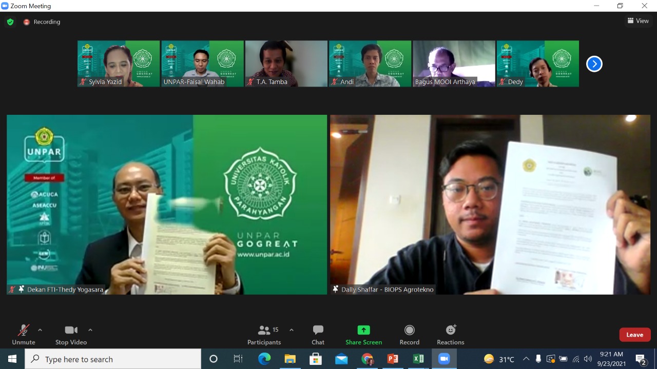 Fakultas Teknologi Industri Universitas Katolik Parahyangan (FTI UNPAR) meneken Memorandum of Understanding (MoU) dengan PT BIOPS Agrotekno Indonesia, secara daring, pada Kamis (23/9/2021). Kerja sama tersebut menjadi salah satu bentuk implementasi Merdeka Belajar Kampus Merdeka (MBKM) sekaligus kolaborasi kedua belah pihak untuk memanfaatkan teknologi dan sains guna membantu sektor pertanian di Indonesia.