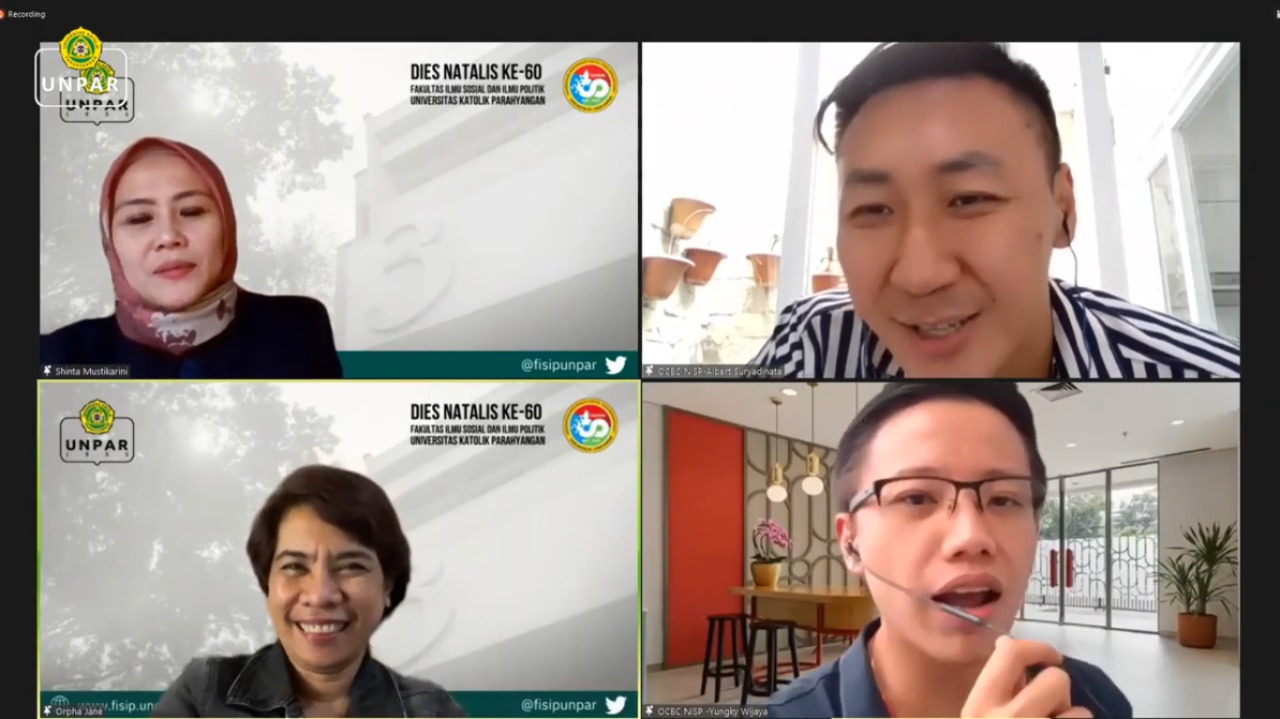 Dalam rangka hari jadinya yang ke-60, Fakultas Ilmu Sosial dan Ilmu Politik Universitas Katolik Parahyangan (FISIP UNPAR) bekerjasama dengan OCBC NISP mengadakan Hari Studi sebagai sebuah momen untuk kembali belajar. Sejalan dengan tema Dies Natalis kali ini yaitu “Membangun Masyarakat Digital yang Bermartabat”, Hari Studi mengusung topik “Digital Banking: Transaksi dalam Satu Genggaman”. Kegiatan dilaksanakan pada Sabtu (21/8/2021) secara virtual dengan mengundang Albert Suryadinata, S.Sos., M.M., Regional Head Jawa Barat OCBC NISP sebagai pembicara.