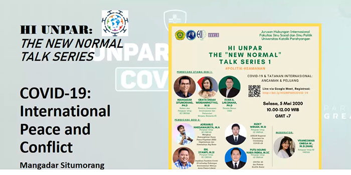 Mengangkat tema “New Normal” tersebut, Jurusan Hubungan Internasional Universitas Katolik Parahyangan (HI Unpar) menyelenggarakan The “New Normal” Talk Series. Rangkaian acara talkshow daring ini dibuka dengan seri pertama bertajuk “Covid-19 dan Tatanan Internasional: Ancaman dan Peluang” yang digelar pada Selasa (5/4/2020) melalui aplikasi Google Meet. Acara yang dipandu oleh Vrameswari Omega W., M.Si. (Han) selaku moderator ini juga disiarkan secara live melalui Youtube Unpar Official.
