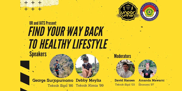 Ikatan Alumni Teknik Sipil bersama dengan Unpar Runners menggelar webinar bertajuk “Find Your Way Back to Healthy Lifestyle” pada Minggu, (16/8/2020). Acara mengundang George Surjopurnomo (Teknik Sipil ’86) dan Debby Meylia (Teknik Kimia ’99) sebagai pembicara dan David Hansen (Teknik Sipil ’03) dan Amanda Mawarni (Ekonomi ’97) sebagai moderator. Acara ditujukan untuk membagikan informasi mengenai kegiatan olahraga kolektif, pengalaman dan tips beraktivitas di kala pandemi.