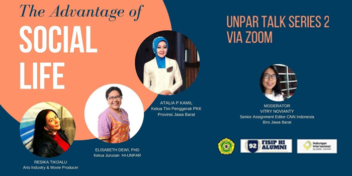 Alumni Hubungan Internasional Universitas Katolik Parahyangan (Unpar) angkatan 1992 menyelenggarakan Webinar bertajuk “The Advantage of Social Life” pada Sabtu (13/6/2020). Webinar ini merupakan yang kedua dalam rangkaian “Unpar Talk Series” persembahan Alumni HI Unpar 1992. Kegiatan diikuti oleh alumni dan komunitas akademik HI Unpar, serta dihadiri dan dibuka secara langsung oleh Rektor Unpar Mangadar Situmorang, Ph.D.