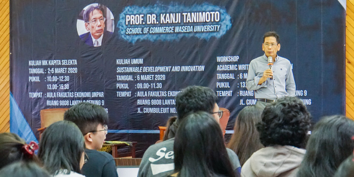 Fakultas Ekonomi Universitas Katolik Parahyangan (FE UNPAR) menggelar kuliah umum bertajuk “Sustainable Development and Innovation” dengan pembicara Prof. Kanji Tanimoto dari School of Commerce Waseda University pada Jumat, (6/3/2020). Kuliah umum ini adalah salah satu dari rangkaian kegiatan dalam rangka visiting professor programme yang diadakan oleh Program Studi Akuntansi UNPAR.