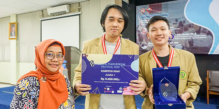Program Studi Sarjana Teknik Kimia Universitas Katolik Parahyangan (TK Unpar) kembali mengukir prestasi di tingkat nasional. Tim mahasiswa sarjana TK Unpar yang terdiri dari Edwin Reynaldi (2016620108) dan Khrysna Taruna Putra (2016620112) berhasil meraih Juara 1 lomba esai tingkat nasional Chemical Engineering Festival (CEFEST) 2020 yang digelar 15 Februari 2020.