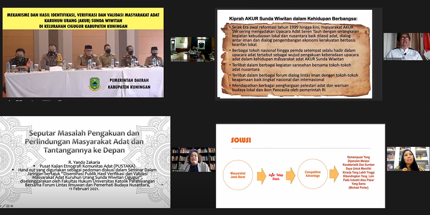 Sebagai bagian dari Diseminasi Penelitian Hasil Verifikasi dan Validasi Tim Penetapan Masyarakat Hukum Adat (PMHA), Fakultas Hukum Universitas Katolik Parahyangan (FH Unpar) bersama Forum Lintas Ilmuwan dan Pemerhati Budaya Nusantara mengadakan forum akademis pada Kamis (11/2/2021). Forum berupa seminar daring ini mewadahi catatan kritis dari pihak masyarakat AKUR Sunda Wiwitan, pemerintah Kabupaten Kuningan, maupun pemangku kepentingan lainnya terhadap hasil penelitian.