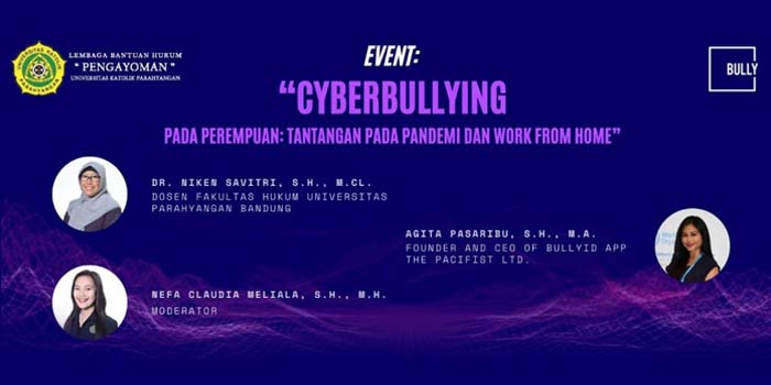Berdasar kepada isu tersebut, Universitas Katolik Parahyangan bekerjasama dengan Bully.id mengadakan Webinar bertajuk “Cyberbullying pada Perempuan: Tantangan pada Pandemi dan Work From Home”. Webinar berlangsung pada Senin (14/7/2020) dengan mengundang Dr. Niken Savitri, S.H., MCL. (dosen Hukum Pidana UNPAR) dan Agita Pasaribu, S.H., M.H. (CEO dan Founder Bully.id) sebagai narasumber. Hadir pula Dr.iur. Liona Nanang Supriatna, S.H., M.Hum selaku Dekan Fakultas Hukum UNPAR dan Nefa Claudia Meliala, S.H., M.H selaku Kepala LBH “Pengayoman” UNPAR serta moderator dalam Webinar kali ini.