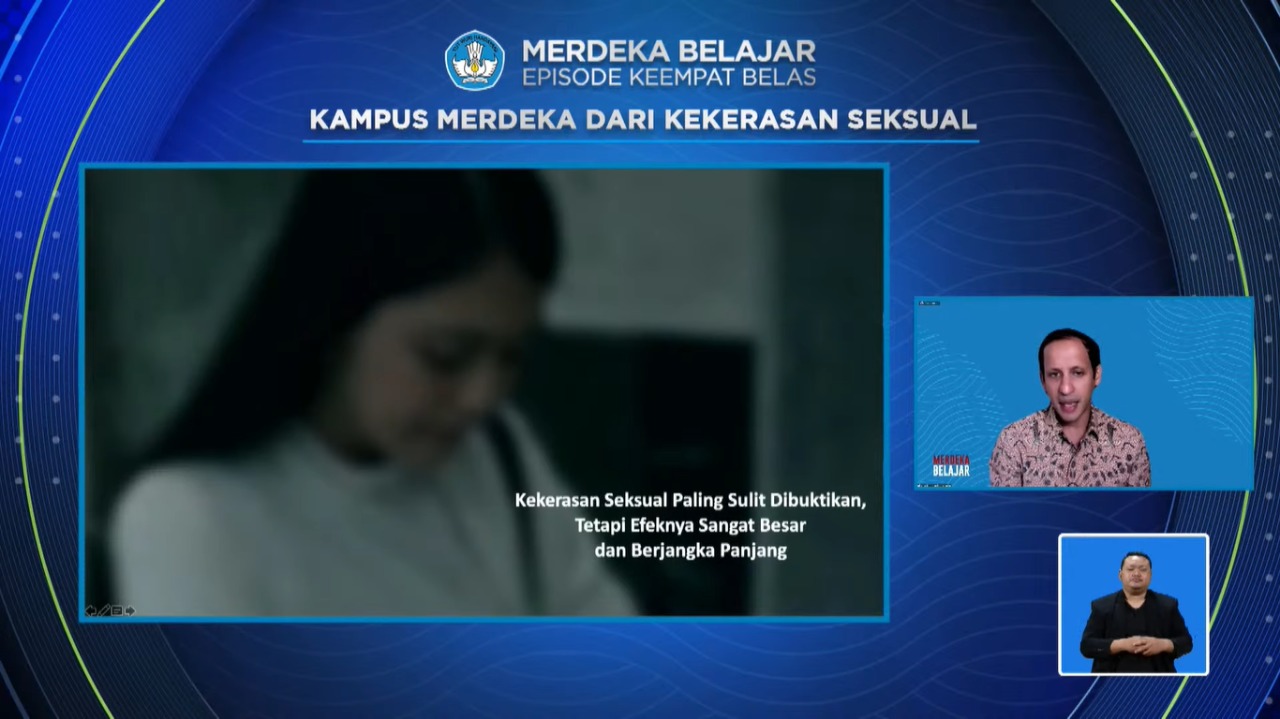 “Kita sudah memiliki beberapa UU tetapi ada kekosongan di dalam perguruan tinggi. Identitas yang belum terlindungi adalah usia di atas 18 tahun, belum atau tidak menikah, dan tidak terjerat sindikat perdagangan manusia, dan kampus masuk di dalam identitas ini. Kami merasa harus ada peraturan yang spesifik dan khusus untuk melindungi korban di dalam lingkungan kampus,” ucap Nadiem.
