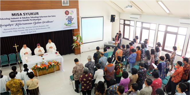 Jumat (20/4), sivitas akademika Fakultas Teknologi Industri (FTI) dan Fakultas Teknologi Informasi dan Sains (FTIS) mengadakan Misa Syukur Dies Natalis FTI dan FTIS. Misa kali ini ditujukan sebagai ungkapan syukur pada Tuhan Yang Maha Esa atas penyertaanNya terhadap perjalanan FTI dan FTIS yang mencapai usia ke-25, atau dikenal sebagai usia perak. Misa tersebut dipimpin oleh Uskup Bandung Mgr. Antonius Subianto Bunjamin.