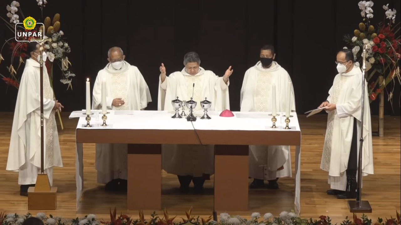 UNPAR.AC.ID, Bandung – Memperingati Dies Natalis ke-67, Universitas Katolik Parahyangan (UNPAR) menggelar misa syukur dan pemberkatan gedung Pusat Pembelajaran Arntz-Geise (PPAG) UNPAR pada Senin (17/1/2022) lalu. Rangkaian misa yang diselenggarakan di Auditorium PPAG tersebut dihadiri oleh Mgr. Antonius Subianto Bunjamin, OSC selaku Uskup Keuskupan Bandung; Mgr. Paskalis Bruno Syukur, OFM selaku Uskup Keuskupan Bogor; Mgr. Christophorus Tri Harsono selaku Uskup Purwokerto; Pastor Basilius Hendra Kimawan, OSC., L.Th. selaku ketua Pengurus Yayasan UNPAR; Pastor Christophorus Harimanto Suryanugraha, OSC selaku Wakil Rektor Bidang Kemahasiswaan; Mangadar Situmorang Ph.D selaku Rektor UNPAR; senat akademik; serta perwakilan sivitas akademika UNPAR.