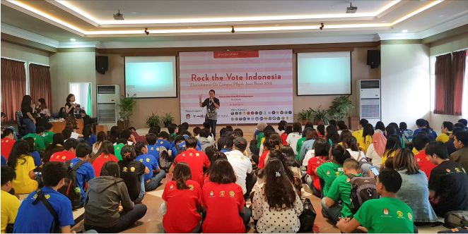 Program “Rock the Vote” diadakan KPU bekerjasama dengan dengan CEPP-FISIP UI. Kali ini, seminar diadakan di Universitas Katolik Parahyangan (Unpar), Kamis (26/4). Narasumber seminar yang berbagi materi maupun pengalaman terkait, diantaranya Dr. Pius Sugeng Prasetyo (Dosen Unpar); Stanislaus Risadi Apresian S.IP., M.A (Dosen Unpar); Dr. Yayat Hidayat (KPU); dan Dr. Abdul Aziz S R (KPU).