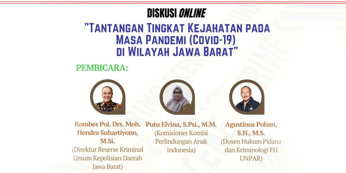 Kisaran pada akhir tahun 2019 atau awal tahun 2020, masyarakat di dunia mengenal Coronavirus (Covid-19) sebagai pandemi. Pandemi ini menyebar hingga ke wilayah Indonesia, termasuk wilayah Bandung dan sekitarnya (Jawa Barat). Banyak hal berdampak dalam kehidupan kita, salah satunya mengenai kejahatan. Kejahatan di wilayah Jawa Barat menjadi fokus pembahasan dalam diskusi online yang diselenggarakan oleh Fakultas Hukum Universitas Katolik Parahyangan pada Jumat, 15 Mei 2020 pukul 15.00 WIB hingga pukul 17.30 WIB.