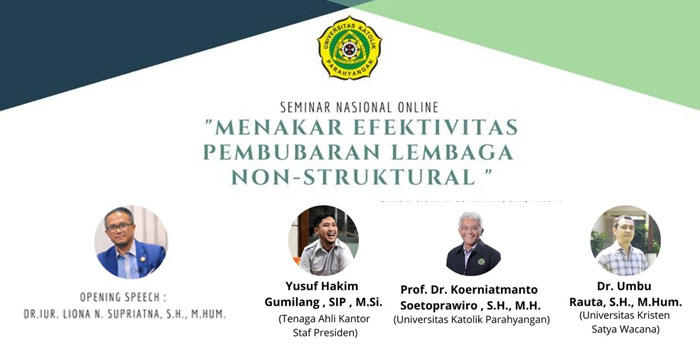 Pada Selasa (22/9/2020), Fakultas Hukum Universitas Katolik Parahyangan (FH UNPAR) mengadakan Seminar Nasional Online bertajuk “Menakar Efektivitas Pembubaran Lembaga Non-Struktural” dengan Victor Imanuel W. Nalle (Mahasiswa Program Doktor Ilmu Hukum Unpar) sebagai moderator. Kegiatan mengundang Yusuf Hakim Gumilang, S.IP., M.Si. (Tenaga Ahli Kantor Staf Presiden), Prof. Dr. Koerniatmanto Soetoprawiro, S.H., M.H. (Dosen dan Guru Besar FH Unpar), dan Dr. Umbu Rauta, S.H., M.Hum. (Dosen Universitas Kristen Satya Wacana) sebagai narasumber.