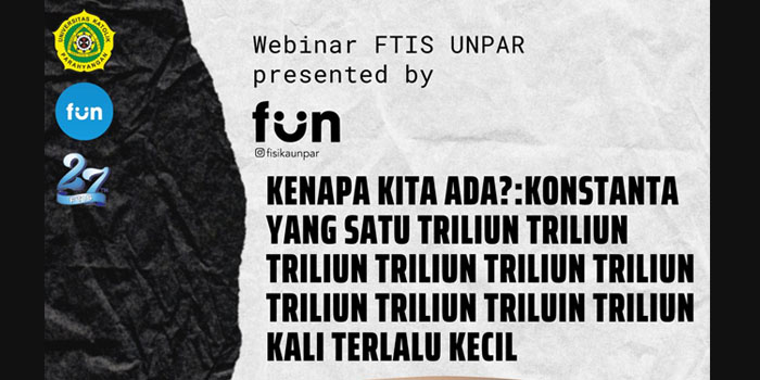 Jurusan Fisika Fakultas Teknologi Informasi dan Sains Universitas Katolik Parahyangan (FTIS UNPAR) kembali menggelar Seri Webinar berjudul “Kenapa Kita Ada?: Konstanta yang Satu Trilun Trilun Trilun Trilun Trilun Trilun Trilun Trilun Trilun Trilun Kali Terlalu Kecil” pada Kamis (6/8/2020). Kegiatan ini mengundang Reinald Primulando yang merupakan Dosen Fisika UNPAR sebagai pembicara.