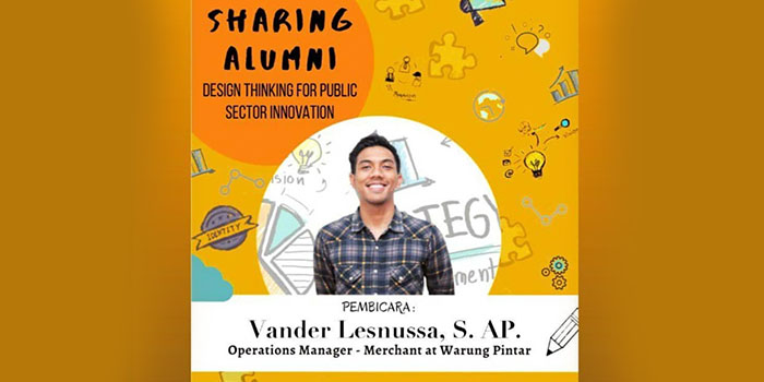 Program Studi Sarjana Administrasi Publik Universitas Katolik Parahyangan (Unpar) mengadakan Sharing Alumni bertajuk “Design Thinking for Public Sector Innovation” pada Senin (4/5/2020). Webinar ini diadakan sebagai bagian dari mata kuliah Inovasi Organisasi dan Wirausaha Publik namun juga terbuka untuk umum. Vander Lesnussa, S. AP., Operation Manager di Merchant Warung Pintar membagikan ilmu dan pengalamannya selaku narasumber. Sharing Alumni dimoderatori oleh Tutik Rachmawati, SIP. MA., Ph.D. selaku dosen dari mata kuliah Inovasi Organisasi dan Wirausaha Publik.