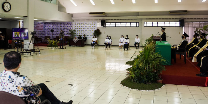 Rektor Unpar menyapa salah satu mahasiswa baru dalam Upacara Penerimaan Mahasiswa Baru yang berlangsung Rabu (9/9/2020). Kegiatan SIAP 2020 diikuti secara daring oleh para mahasiswa baru Unpar.