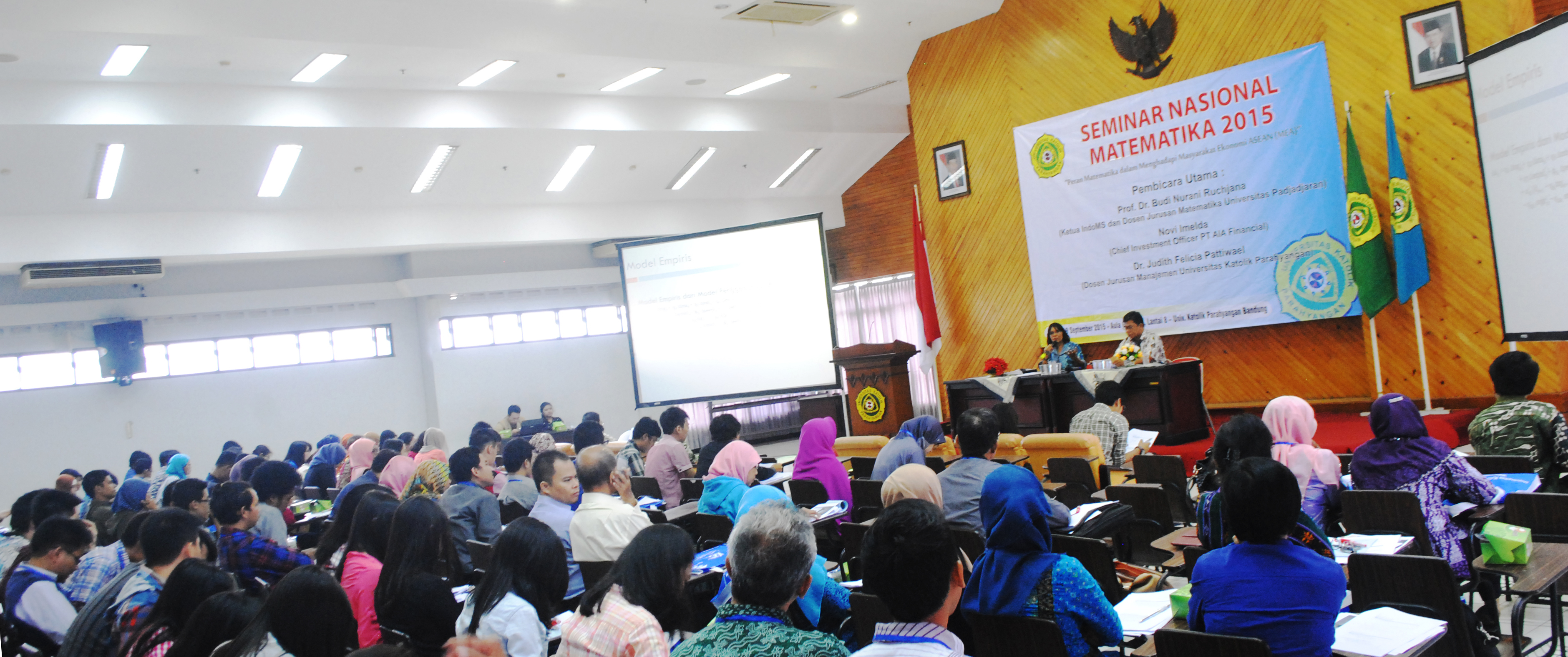 The 2015 Mathematics National Seminar themed “The Role of Mathematics in Facing the ASEAN Economic Community” was held on Saturday (19/9). The seminar is a regular event hosted by the Mathematics Study Program of the Faculty of Information Technology and Science. It was held in the Hall of Building 9 of Parahyangan Catholic University and presented 3 resource persons, namely: Prof. Dr. Budi Nurani Ruchjana (the chairman of Indonesian Mathematical Society/IndoMS, Lecturer in Padjadjaran University), Novi Imelda (Chief Investment Officer PT. AIA Financial), and Dr. Judith Felicia Pattiwael (Lecturer in the Management study program of Parahyangan Catholic University).