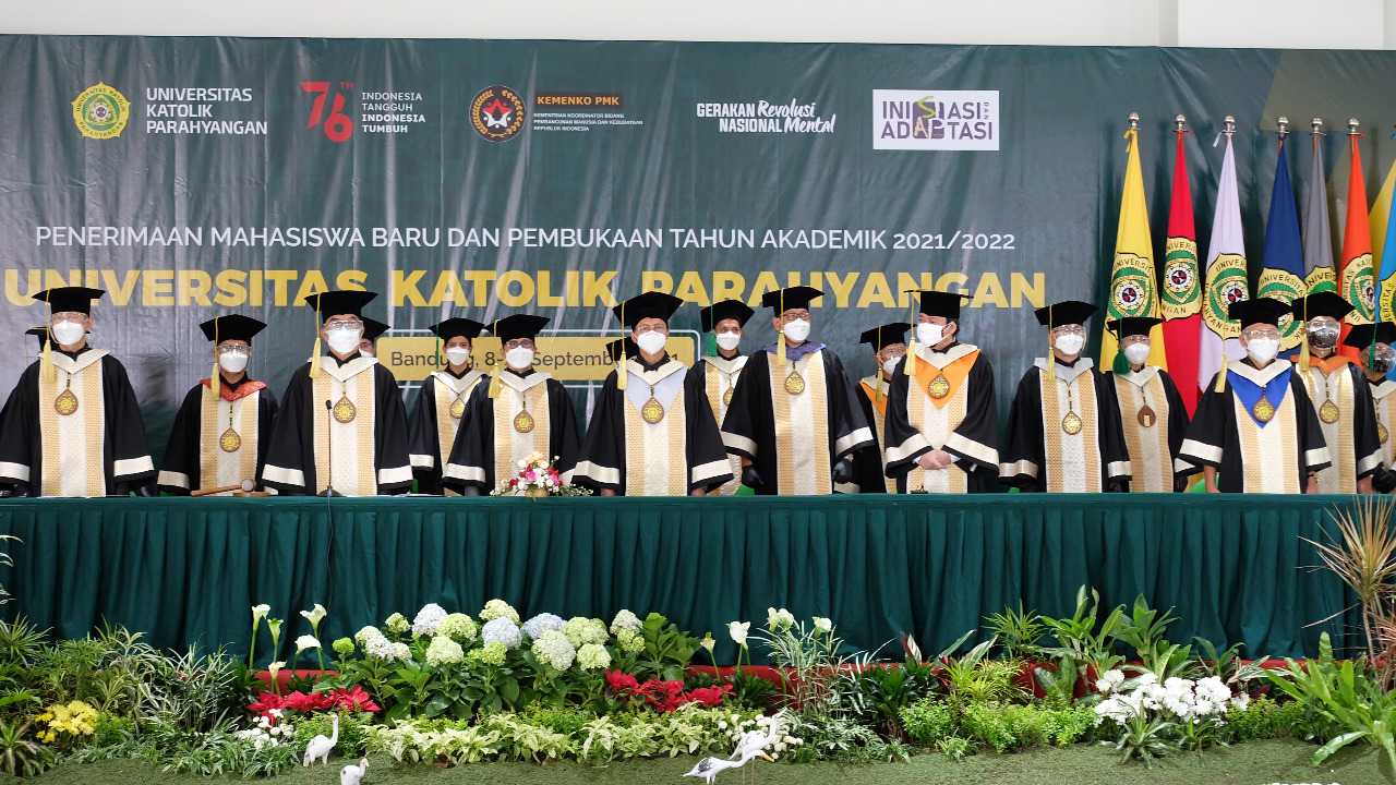 Rektor Universitas Katolik Parahyangan (UNPAR) Mangadar Situmorang, Ph.D. mengukuhkan 2.455 mahasiswa baru UNPAR jenjang D-3, S-1, S-2, S-3, dan Program Profesi Insinyur Tahun Akademik 2021/2022 secara virtual, Senin (8/9/2021). Secara simbolis, penerimaan dilakukan dengan menyerahkan jaket almamater oleh para dekan kepada 7 perwakilan mahasiswa dari Fakultas Ekonomi, Fakultas Hukum, Fakultas Ilmu Sosial dan Ilmu Politik, Fakultas Teknik, Fakultas Filsafat, Fakultas Teknologi Industri, dan Fakultas Teknologi Informasi dan Sains, di Gedung Pusat Pembelajaran Arntz-Geise (PPAG) UNPAR.