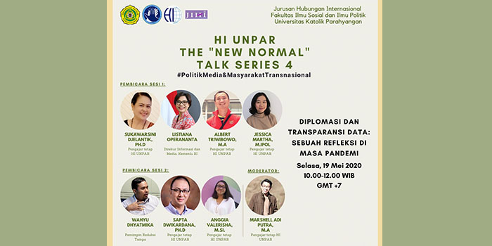 Jurusan Hubungan Internasional Universitas Katolik Parahyangan (HI Unpar) kembali menggelar Webinar The “New Normal” Talk Series yang keempat pada Selasa (19/5/2020) dengan mengangkat tema “Diplomasi dan Transparansi Data: Sebuah Refleksi di Masa Pandemi”. Webinar yang dibagi ke dalam dua sesi tersebut mengundang pakar dan praktisi HI serta narasumber yang berkecimpung di bidang Politik Media dan Masyarakat. Webinar ini pun dipandu oleh Marshell Adi Putra, M.A sebagai moderator.