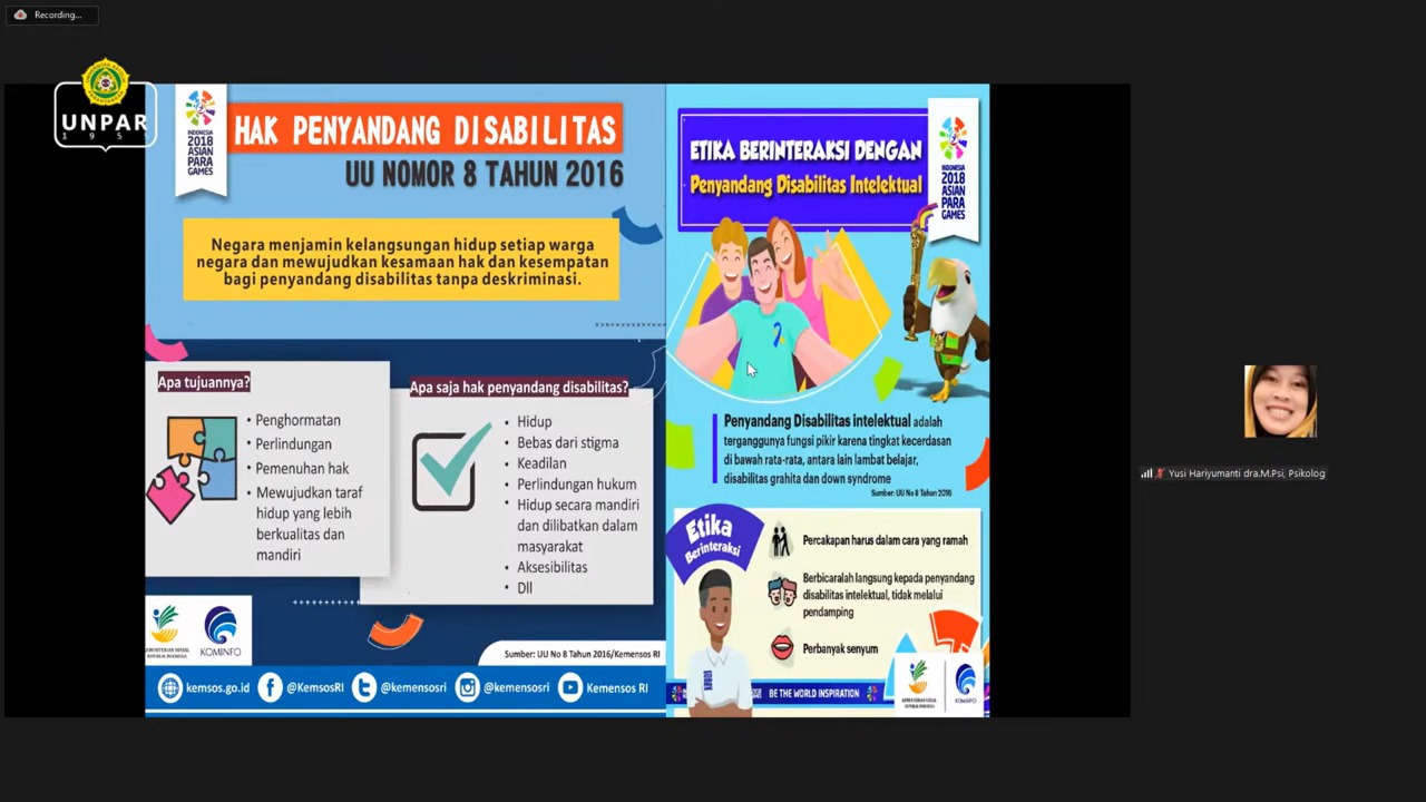 UNPAR.AC.ID, Bandung – Hadirnya Undang-undang (UU) Nomor 8 Tahun 2016 tentang penyandang disabilitas, memberikan perubahan yang fundamental untuk merekonstruksi perspektif masyarakat terhadap penyandang disabilitas dengan tidak lagi memandang disabilitas sebagai objek atau orang yang memiliki kekurangan fisik maupun mental dan memasukkan perspektif Hak Asasi Manusia (HAM) bagi disabilitas agar mendapatkan aksesibilitas yang setara dengan masyarakat yang lain.